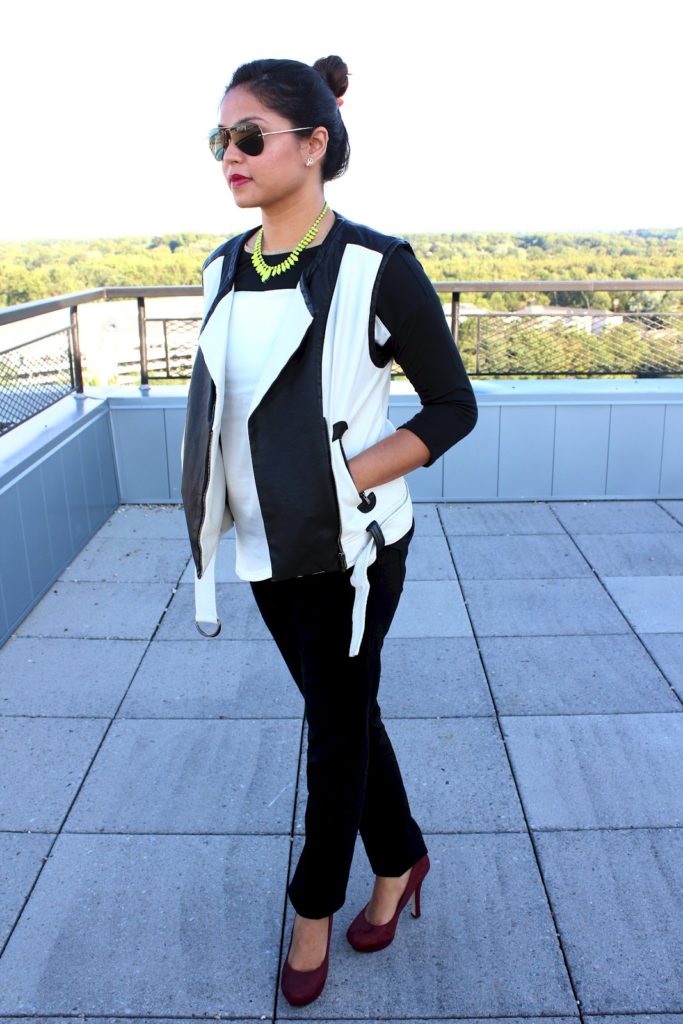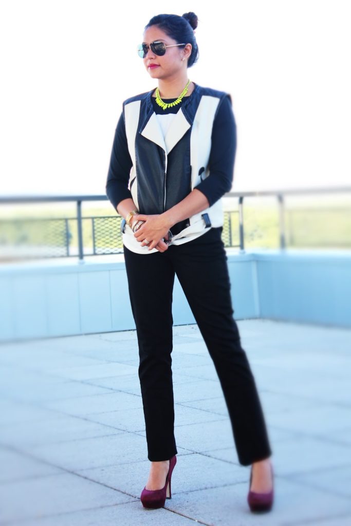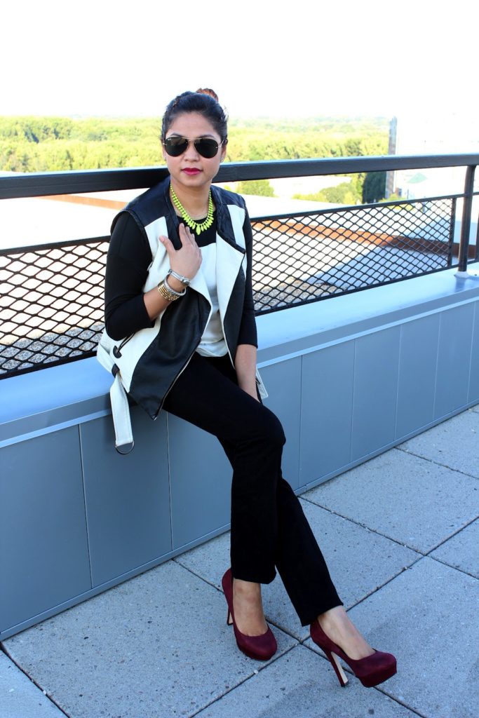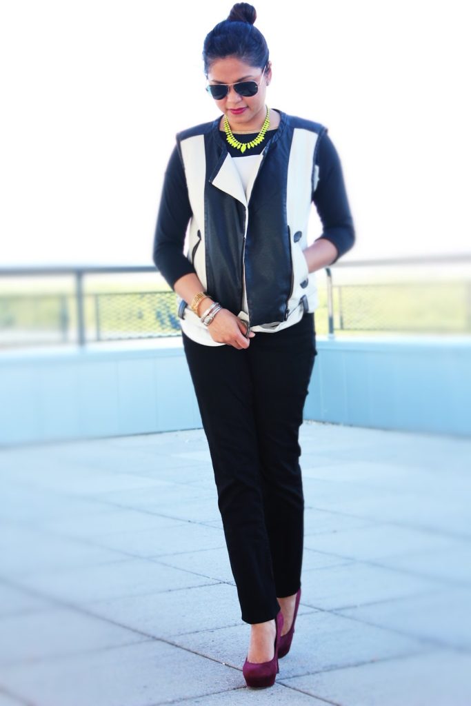 So I have put together a very simple monochromatic look embracing the fall trends :- bright lips, leather moto vest, neon accessory and above all OXBLOOD shoes. There are more fall trends that I would be incorporating gradually into my outfits and posting them soon for you lovely people.