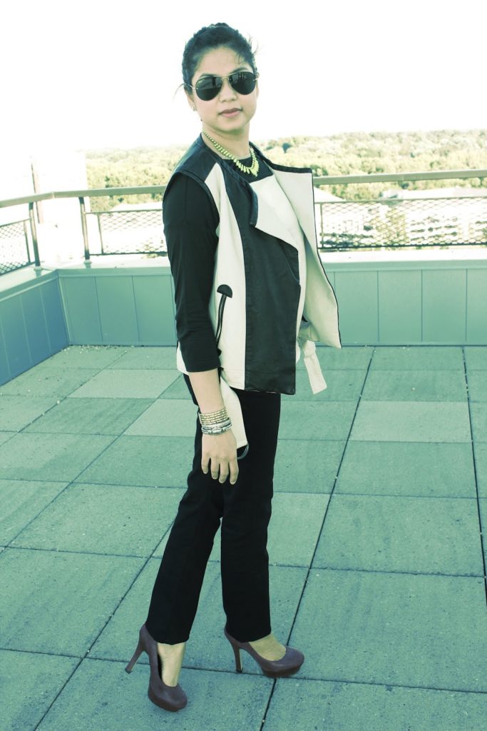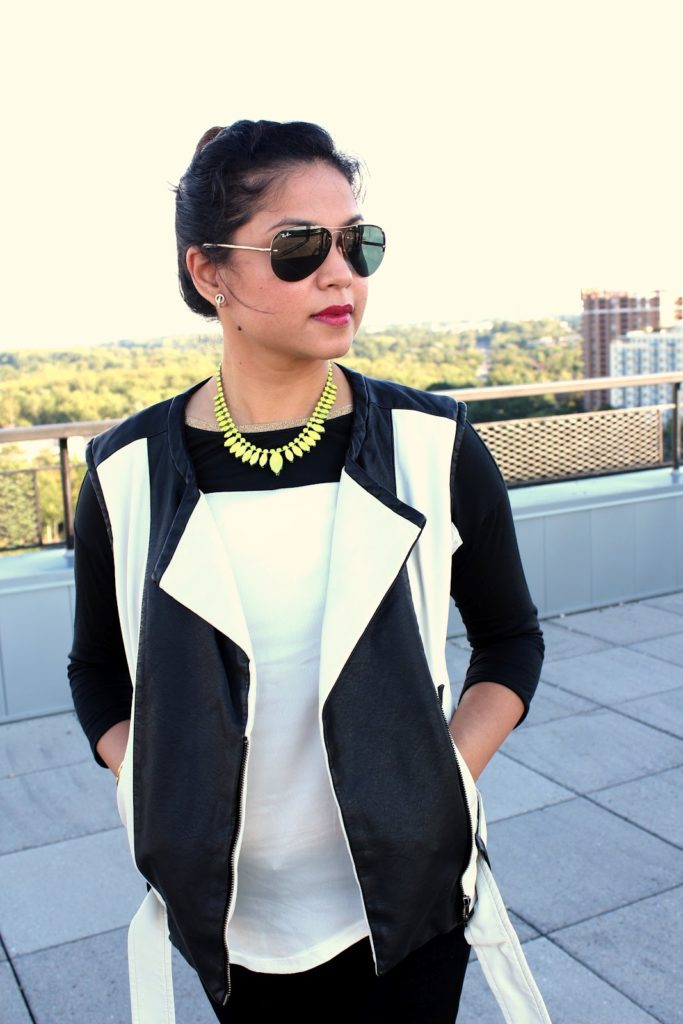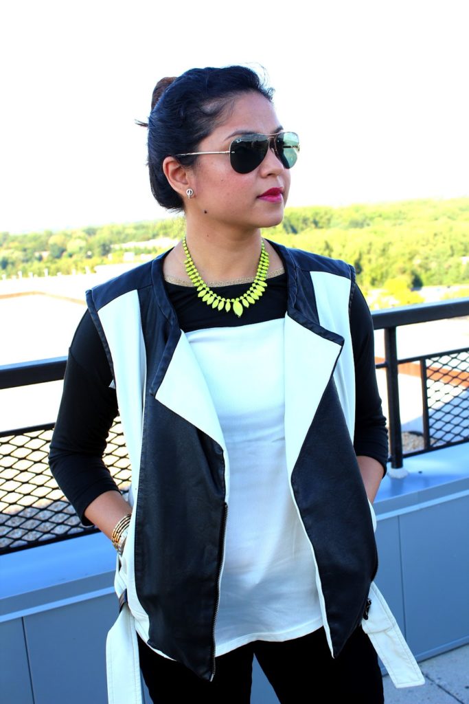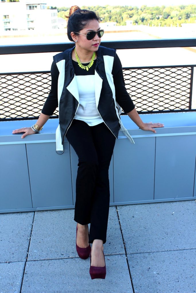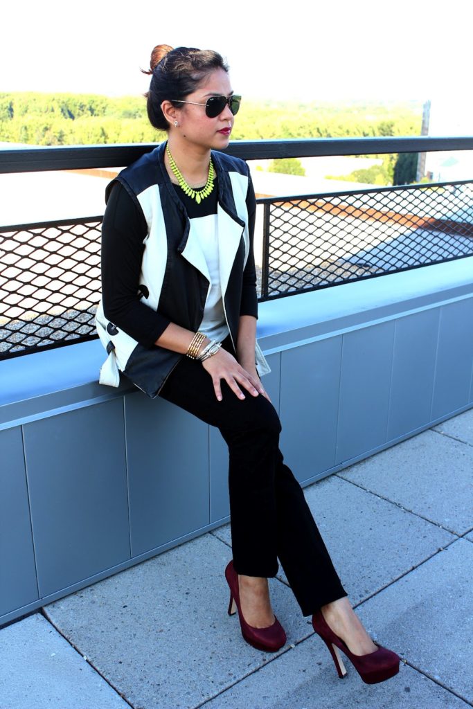 So I have put together a very simple monochromatic look embracing the fall trends :- bright lips, leather moto vest, neon accessory and above all OXBLOOD shoes. There are more fall trends that I would be incorporating gradually into my outfits and posting them soon for you lovely people.