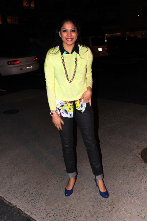 I love the neon sweater and blue pumps – you're so good at incorporating pops of color in your outfits!!