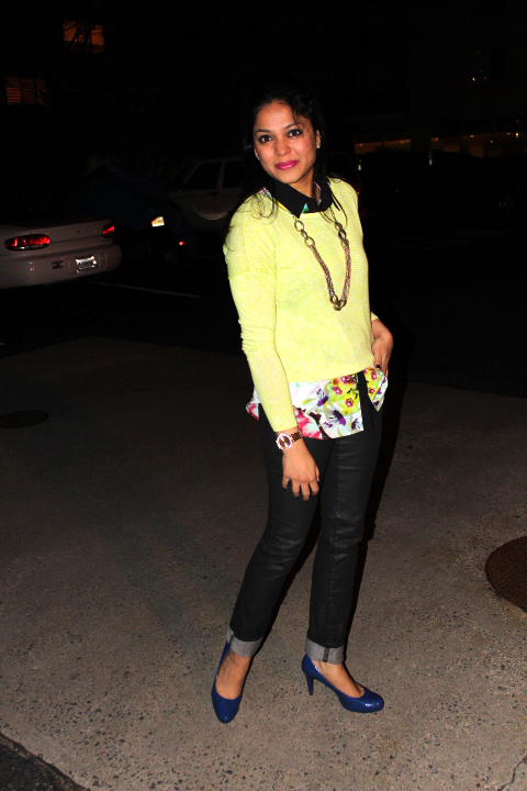 This is super cute Saumya! Love those shoes and sweater paired with the cobalt blue shoes.