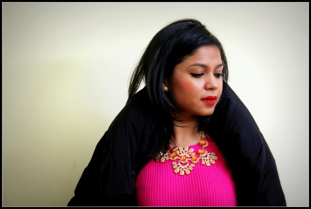 A week long trip to Canada was all I needed for an instant rejuvenation and an excuse to stop by at the Woodbury premium outlets, en route home for some Black Friday shopping. Undoubtedly, my wallet was unhappy about this shopping stopover, but who could, atleast I couldn’t pass on the irresistibly good deals. The jacket, the sweater and the booties are the outcome of this shopping extravaganza. I would have never dared to own a puffer jacket, mainly for it’s undesirable bulking around the top half, but this one, I was sold. The mixed media pillow collar jacket is not only stylish and warm but the cinching around the waist does all good for me and would for anyone too.