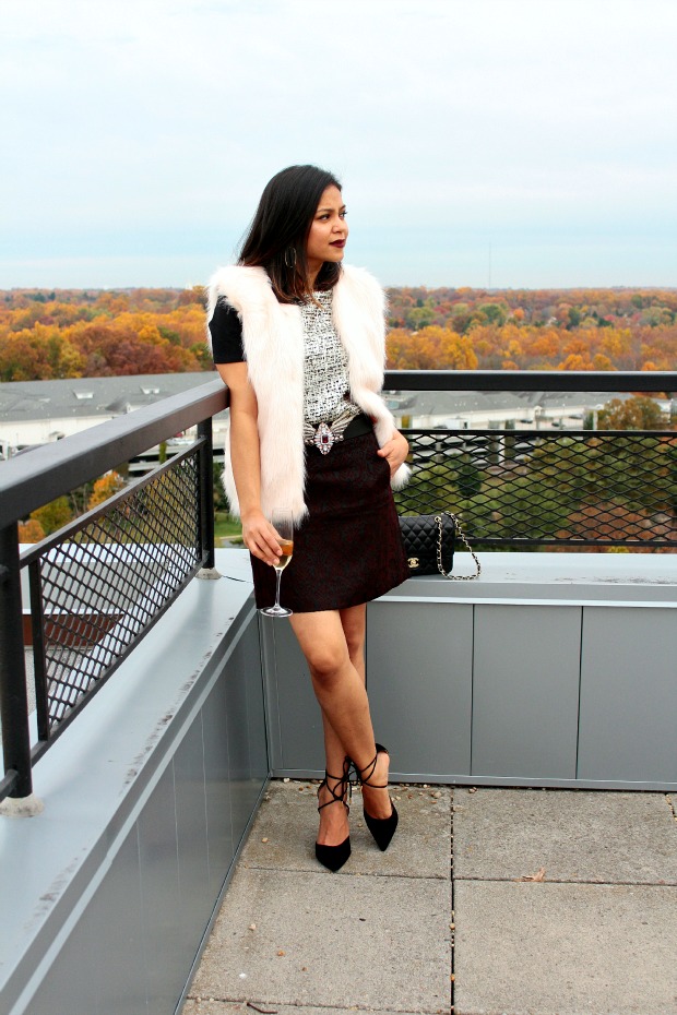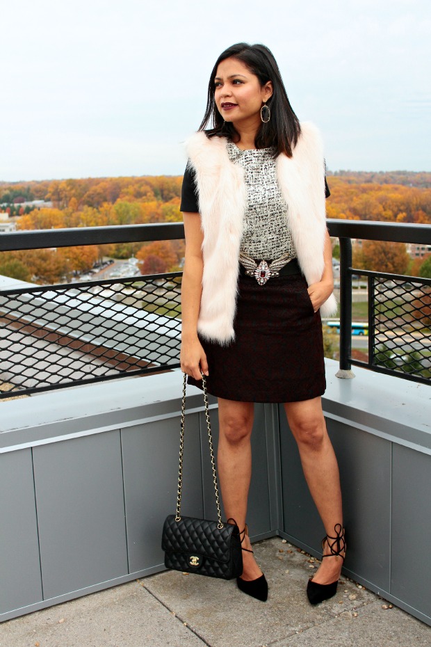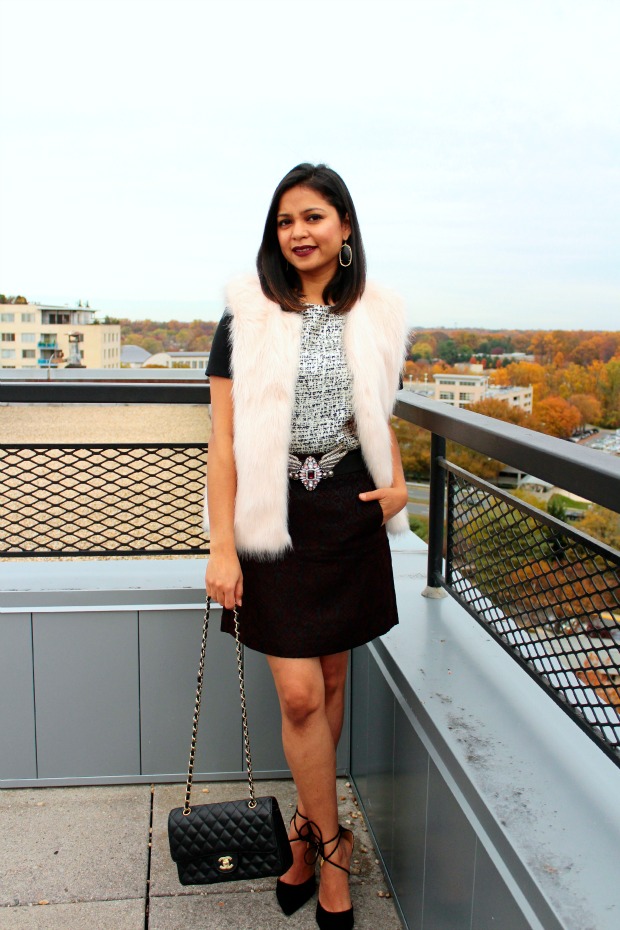 My look for today serves as an inspiration for one such parties. Fall 2015 is all about the A-line mini skirts and wearing one to a party will only step up the fashion-game. I have been hoarding these a-line mini skirts, and now have a collection of my own. Anyways, if you are wussy about the cold, throw on a pair of solid tights underneath and you are set. For a more festive vibe, couple the skirt with a metallic, sparkly or even a sequins top and you’ve raised all style bars. A fur vest will add the luxe party element and a statement buckle belt will play the star of the show. For the finishing touches, bring your favorite bag, strut around in a killer pair of heels and voila!!!!- “you’ve just won the best dressed award !”- HAPPY FRIENDSGIVING !