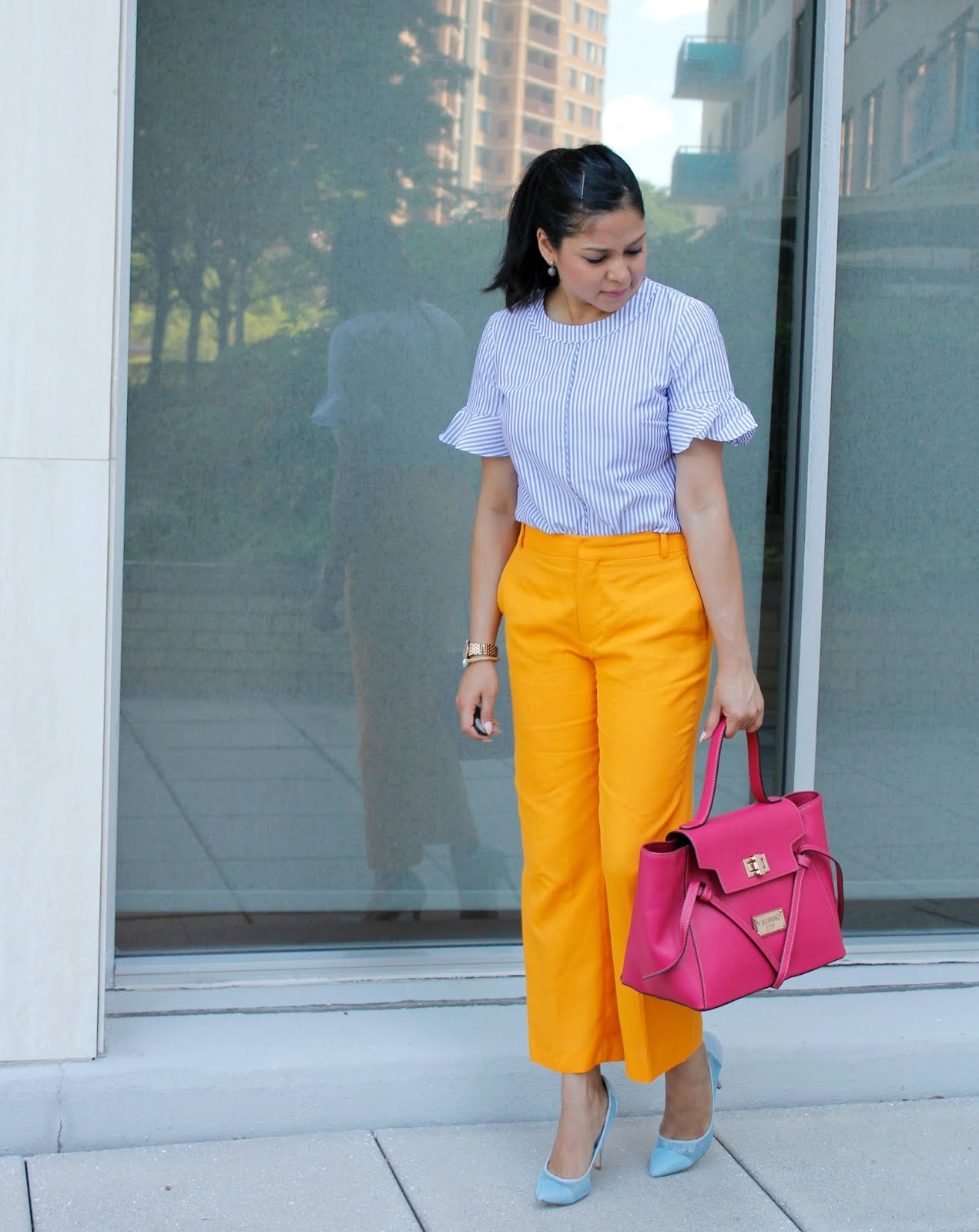 - if your office allows color, then go for a bold pair of straight-fit trousers. If a pair of bright bottoms is out of your comfort zone, then a bright top could be the alternative.