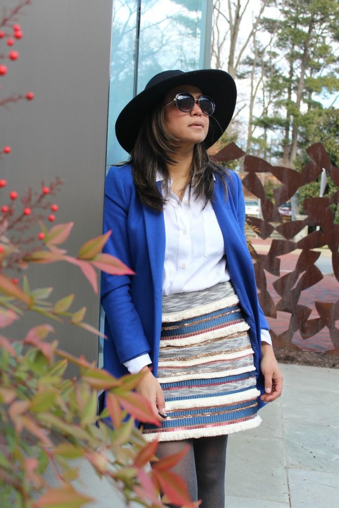 It was so easy to incorporate a white button down in my outfits: first here yesterday and now here today. An easy way to give a facelift to any plain shirt is to couple it with something fun and snazzy. This skirt definitely comes in handy in taking the white blouse up a notch. Since the skirt was a jolt of drama, I kept the accessories minimum, letting the top and skirt take center stage. Needless to say “it was cold and hence the blue jacket!! “