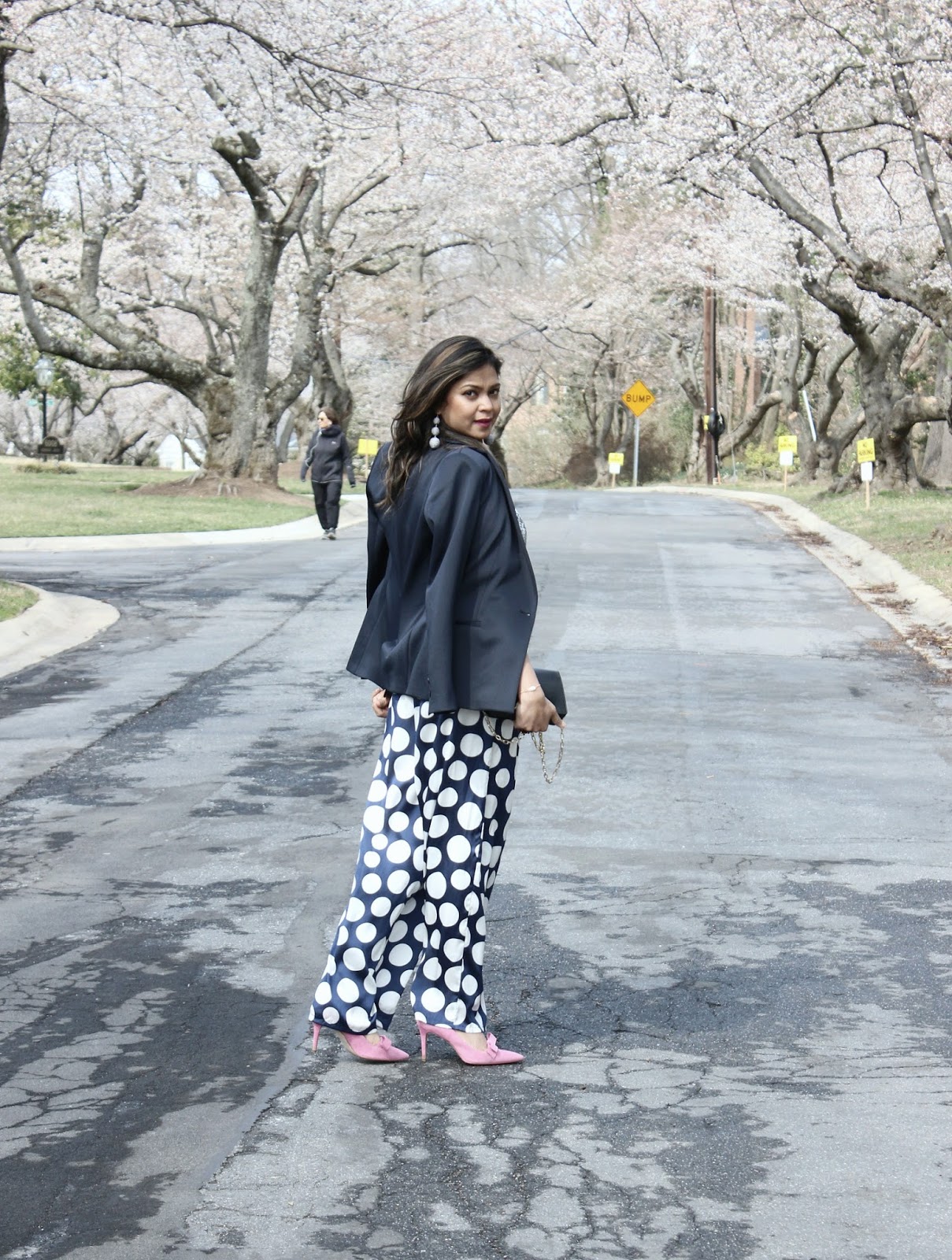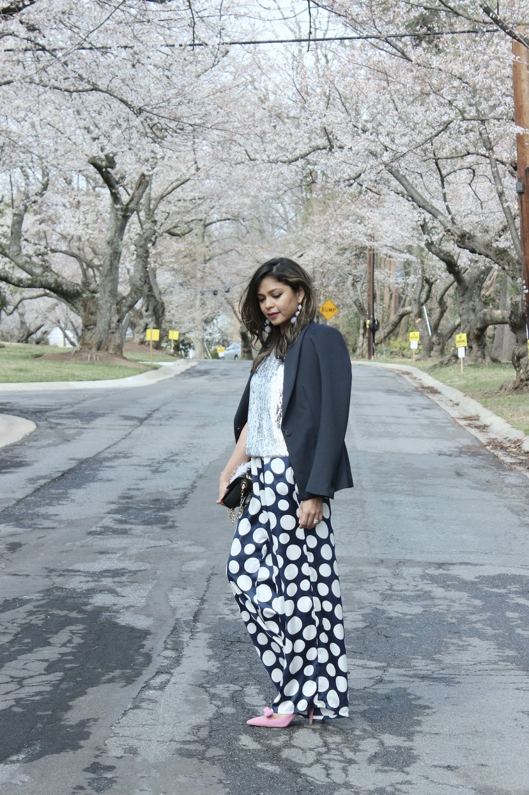I chose some daytime sparkle to sink in the festive vibes, added a fun element with those polka dot pants and finished off with some pink kicks. What if its was hard to find that energy around me, I managed my own sartorial cheer up….
