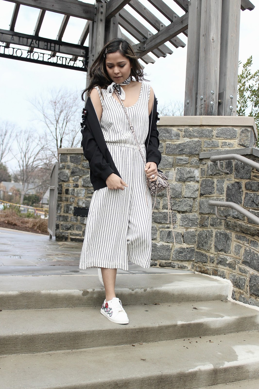 But if you know me well, you would definitely know that yours truly doesn’t understand the language of uber casual. It is a contradiction to the above, but truth be told, I feel even my casuals are a tad bit dressed up. Honestly, flip-flops, or sweat shirts or pajamas or T-shirts, which BTW for many define causal, are totally out of my sartorial comprehension. I have to have at least one element in my outfit that would speak dressy. For instance, the embellished bomber jacket and the neck scarf in my look, make this look anything but dressed-down.