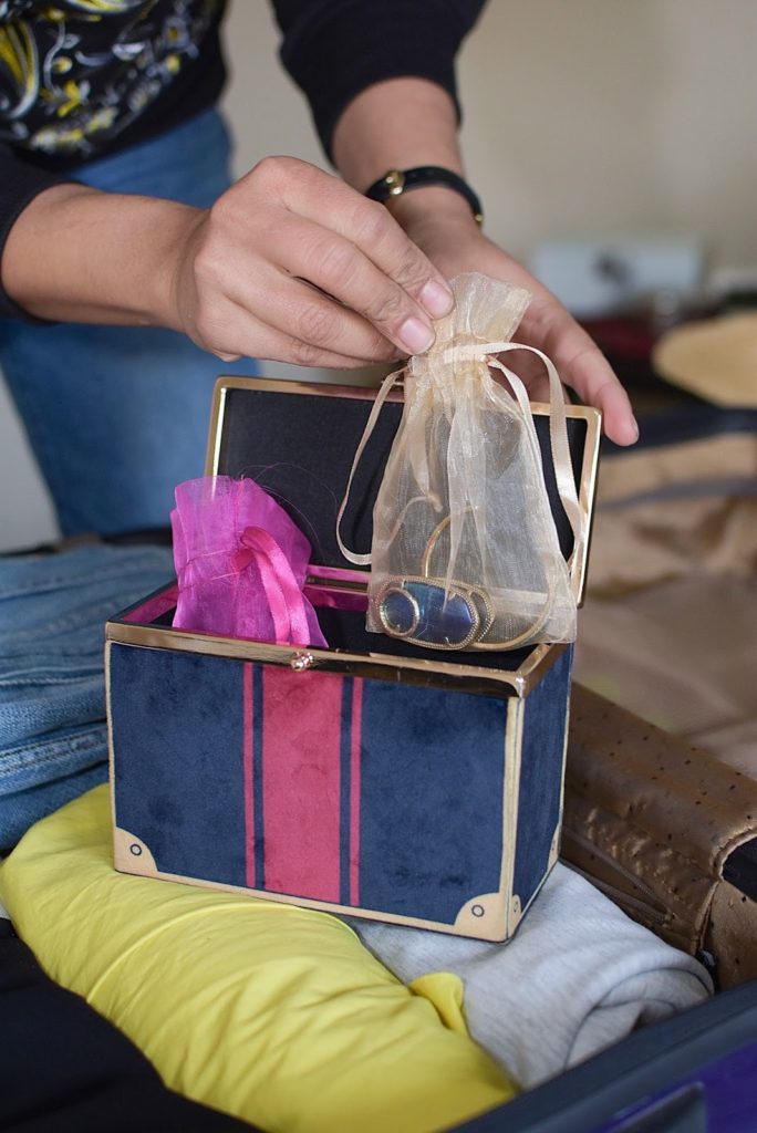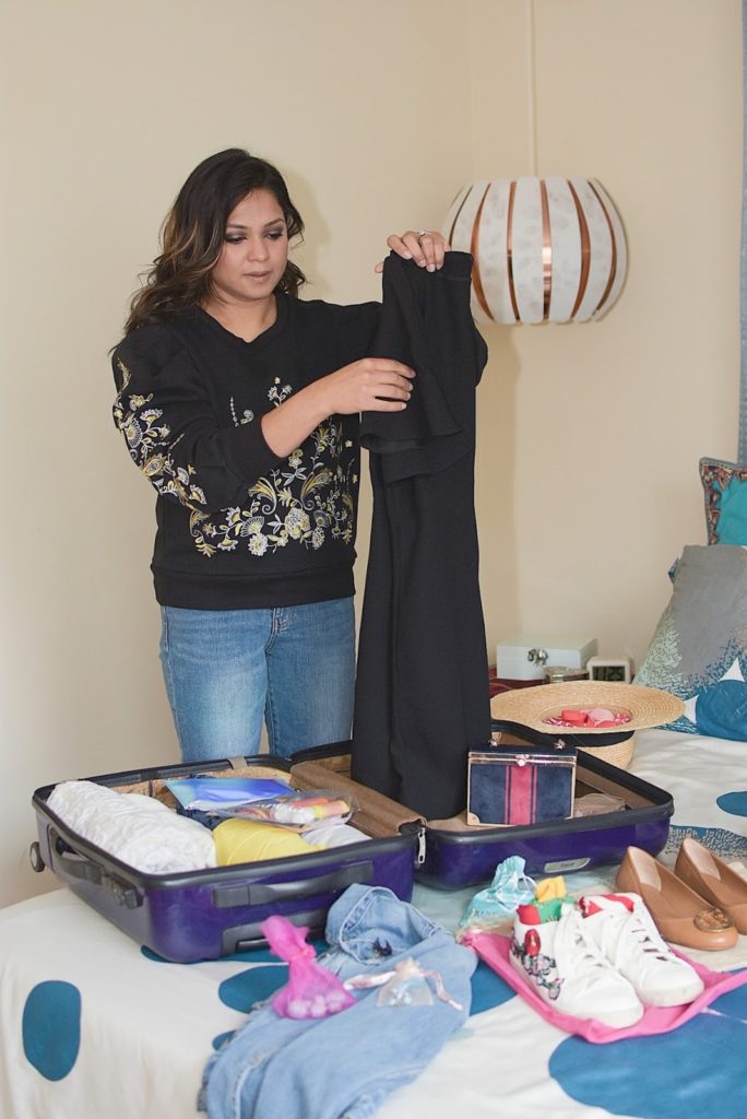 2) CLOTHING : depending on your destination and the no. of days you are out, decide the kind of clothes you need. For my weeklong tropical destination, I am bringing two pairs of shorts with a t-shirt and a blouse to go with each, three dresses, a pair of jeans with two easy-breezy printed blouses, and a denim jacket. You never know how and when the temperatures might change, so a denim jacket has made it’s way to the suitcase. In addition, an LBD ( little black dress ) for the unexpected date night is also tagging along. The best way to maximize your space, is to roll up the clothing and place them tightly in the crevices of your suitcase base.