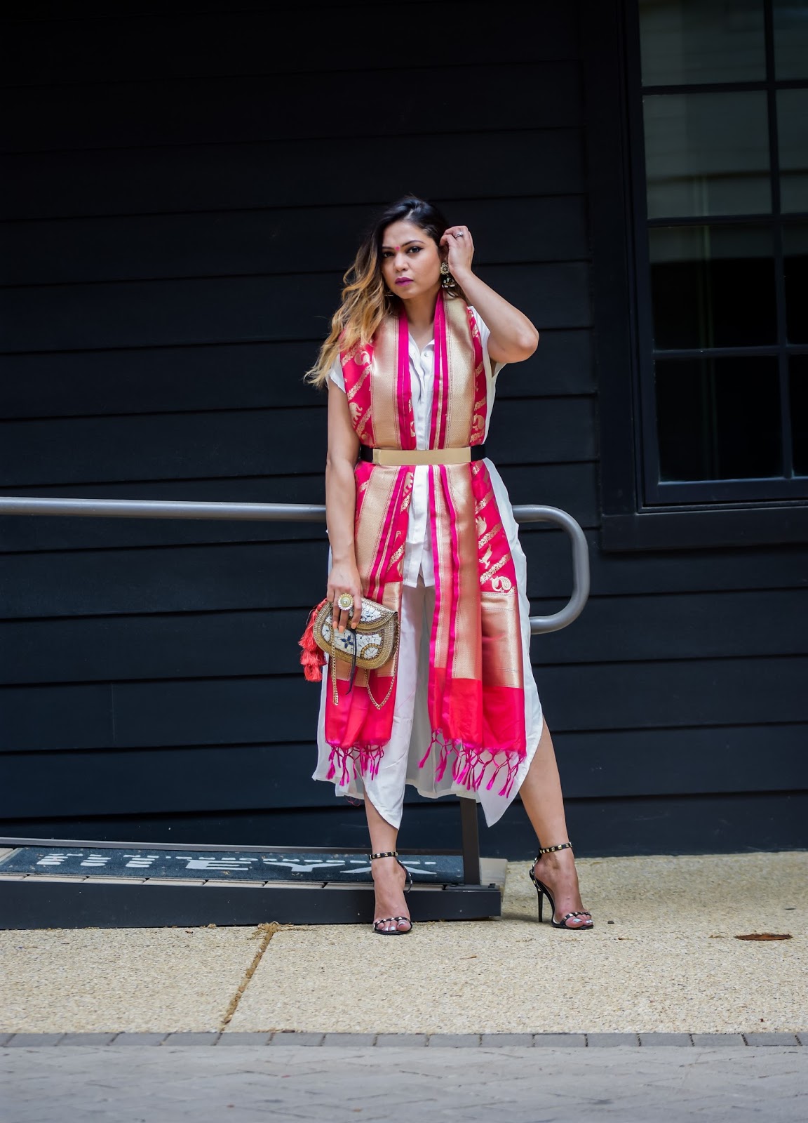 As much as I love my western clothing, I never miss a chance to show some love to my Indian traditional clothing as well! Honestly speaking, I don’t have much of traditional clothing, the lack of occasions to wear em as often justifies my situation, but whatever I have I try to repurpose them to create different outfits. For instance my custom made Dhoti-Kurta that I wore to NYFW last September with the mirrored embellished vest, post HERE, couldn’t look any chicer than when paired with that belted banarasi dupatta ( stole ) and stilettos.