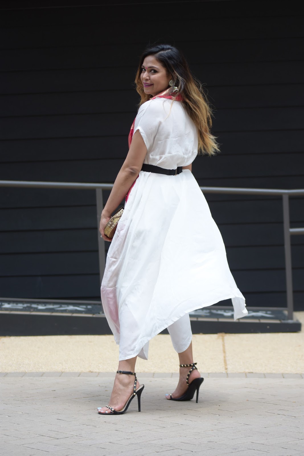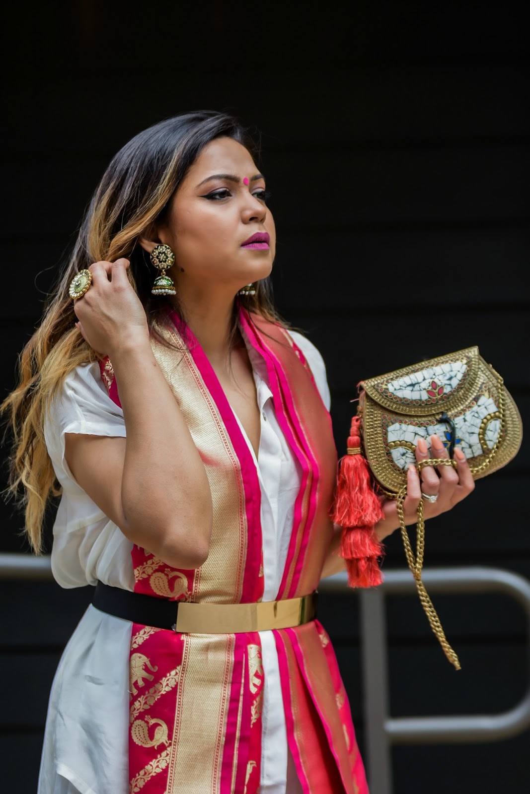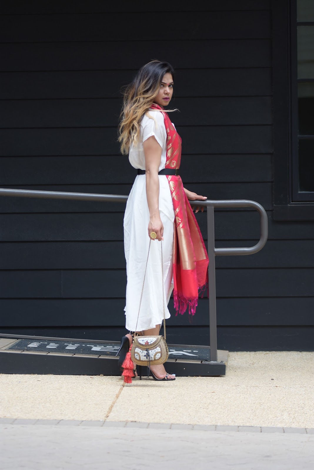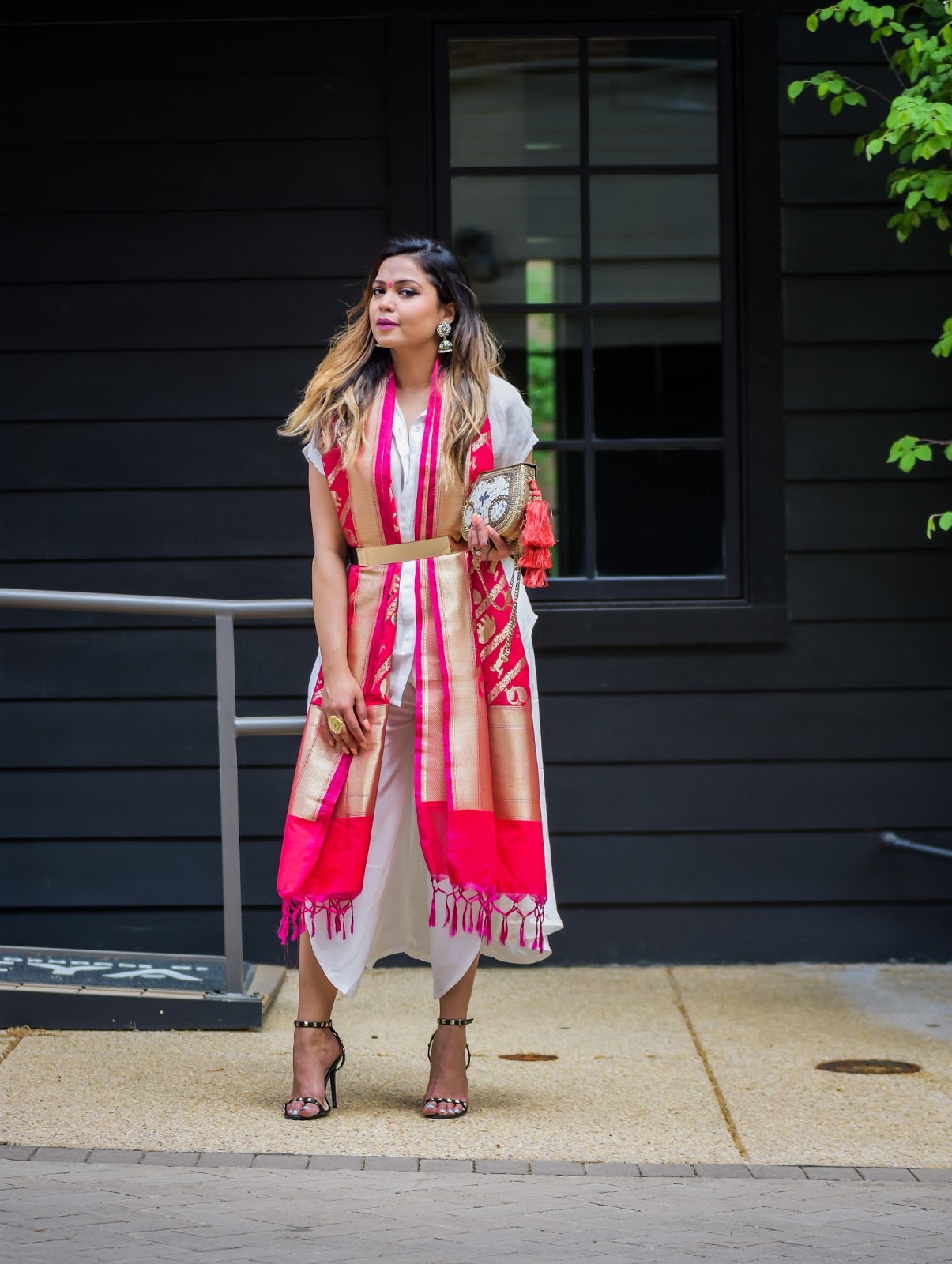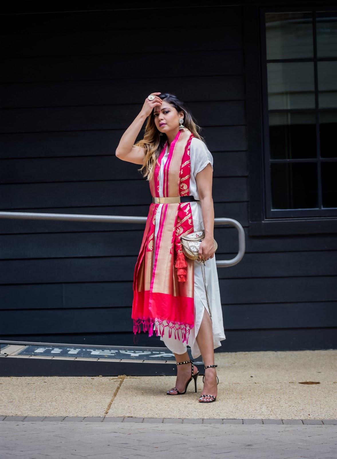 My mom gifted me that dupatta ( stole ) last year and I had been looking for ways to incorporate that in my outfit. I did wear it once on a religious occasion with a sari, but for a self proclaimed closet-repurposing-queen i.e moi, it was of paramount importance to style the stole in multitudinous ways. I knew I wanted to pair the hot pink dupatta with something white, but the belt and coordinating sandals were impromptu and I didn’t seem to mind them at all. It kind of elevates the look from being traditional to edgy-traditional…….which I like……..what about you?