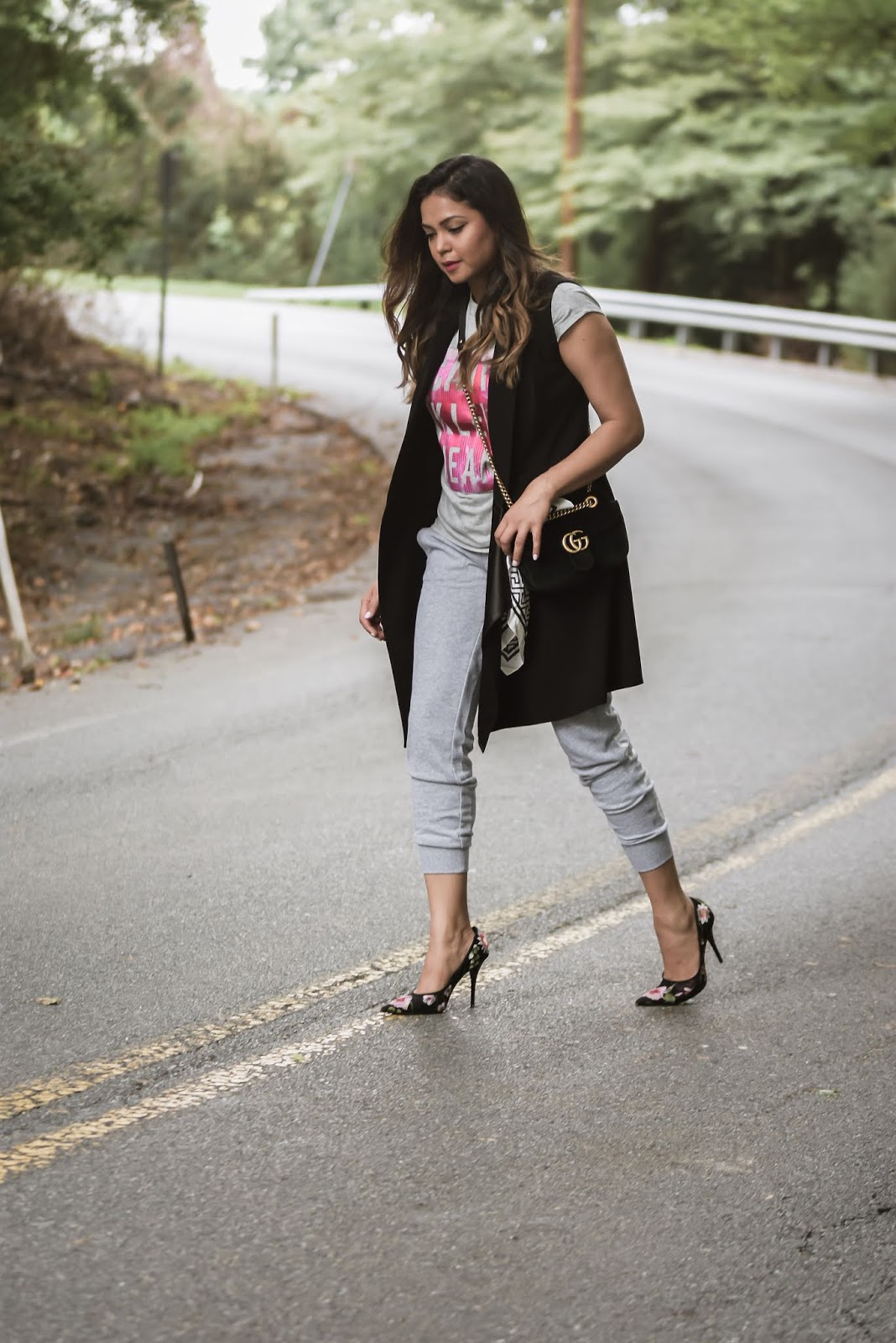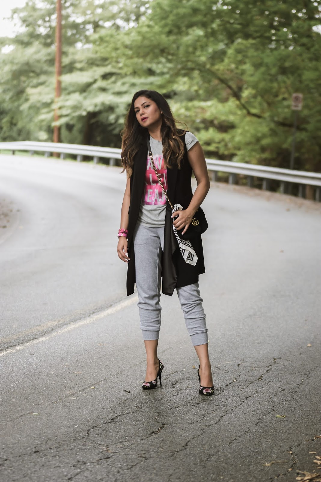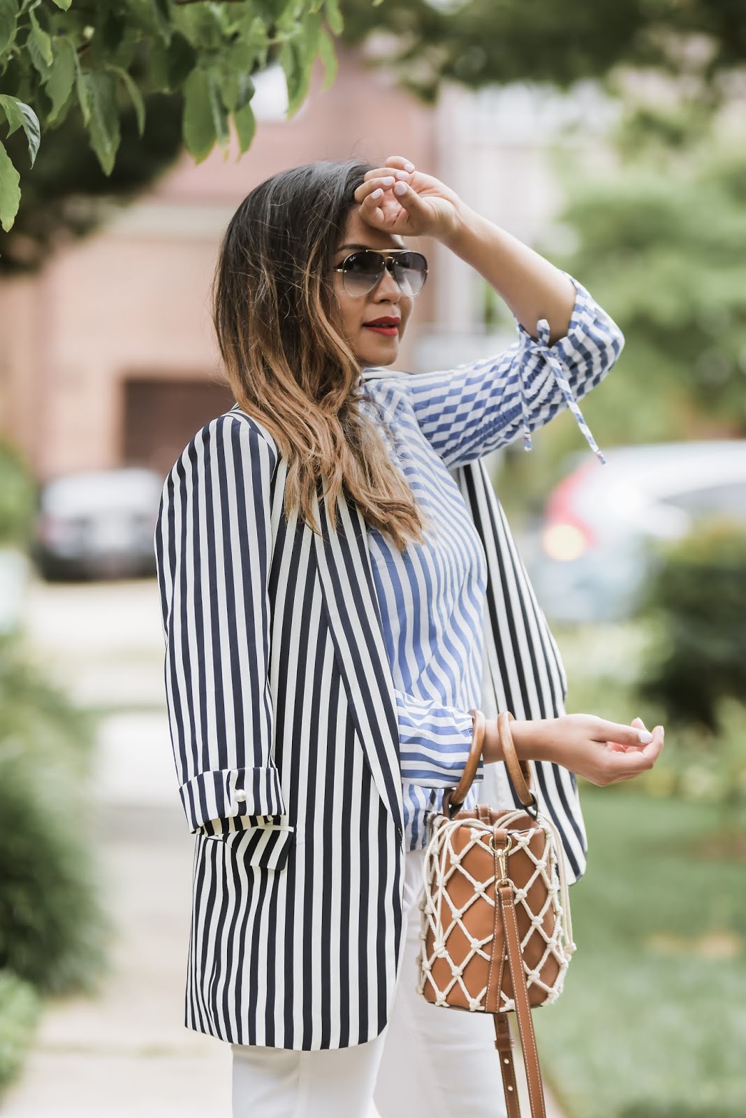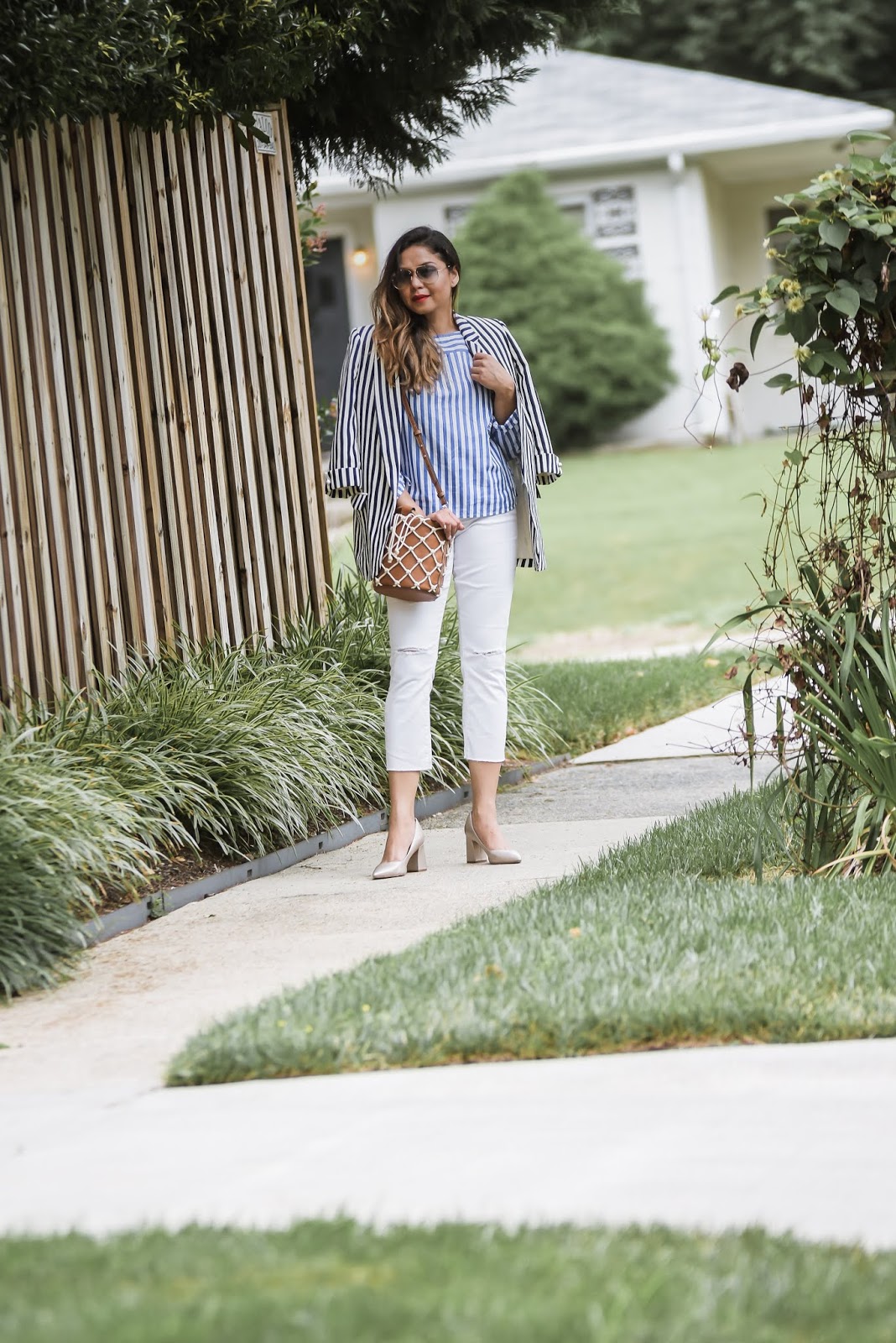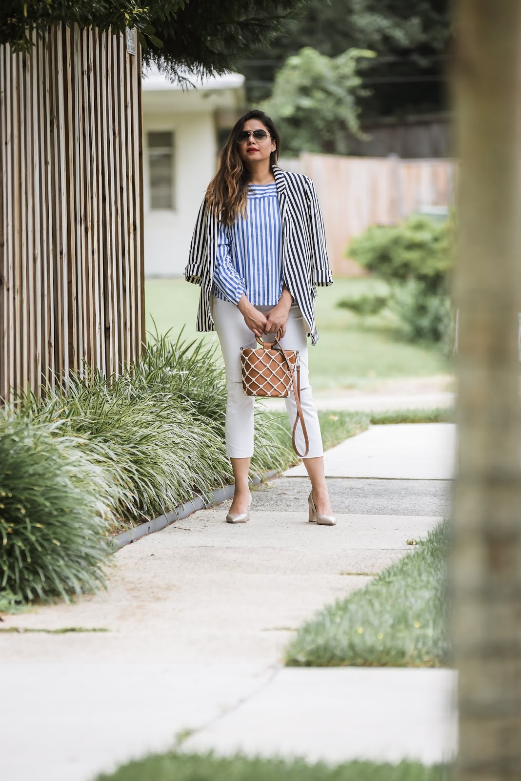 The first look is a dressier version of athleisure with joggers and high heels and the second look is more nautical with double-duty stripes and white crop jeans. The joggers and t-shirt are from Calvin Klein and the white denim and blue stripe blouse are from Tommy Hilfiger. The other pieces, shoes and accessories are my own.