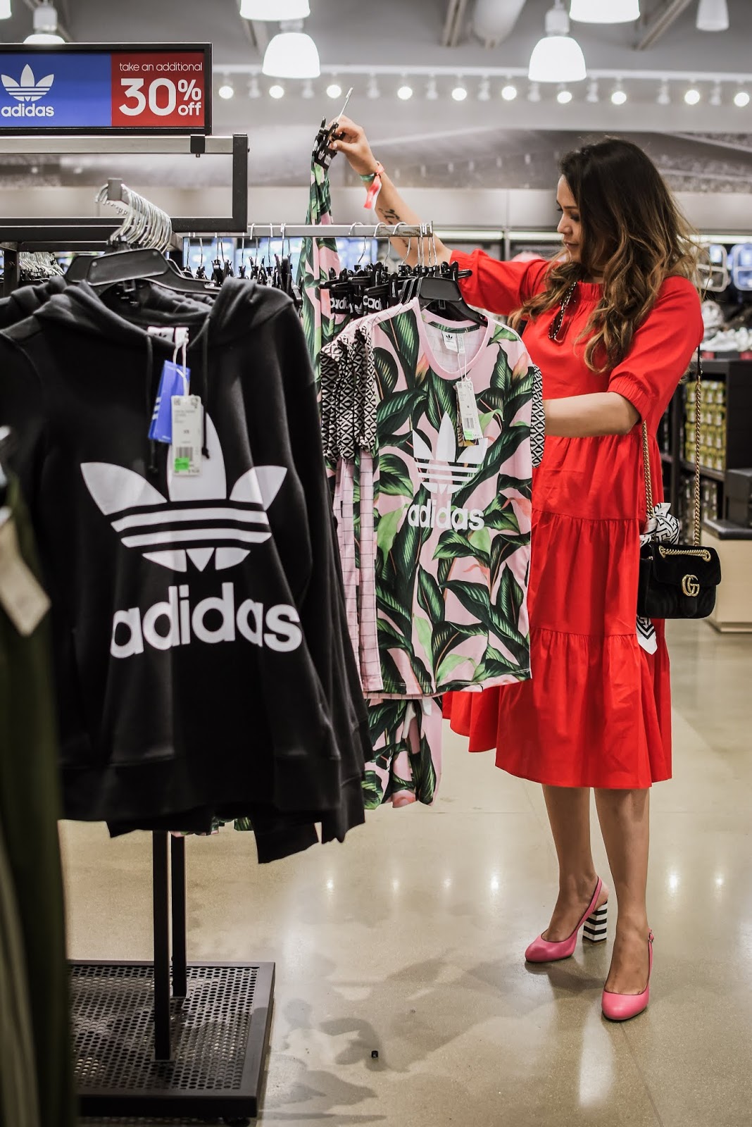 I am not going to lie, ” it has been a while I shopped at the Adidas store.” I was stoked to see how this store has transformed sartorially over these years. First thing that caught my eye was the palm print pink track pant and t-shirt set, and did I mention the matchy-matchy bomber jacket !!! These pieces were already marked down with an extra 30% off. Luckily, the store had my size in each piece. Did I buy this set or not ??? You will have to come back here tomorrow to see it for yourself.