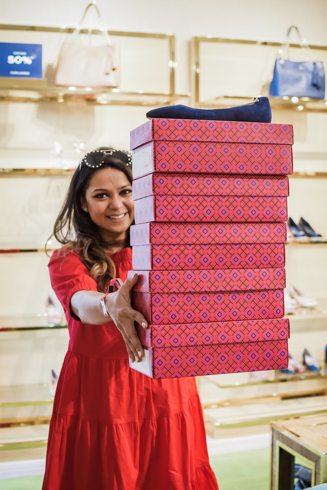 My first stop was Tory Burch. Here I registered for the program and was also given my personal rewards wrist band. They had a super cute floral cart where the associate greeted me with some sweet treats. Tory Burch outlets are known to house the collection that you might find at the retail stores for a slightly hiked price. So if you are looking for something from the current collection, you might want to check the outlets before you pull the trigger at the retail location. You never know when you might hit a jackpot. The 50% off footwear and 40% off everything else was too good to pass and this shoeaholic had to pick out a pair ( pictured below ).