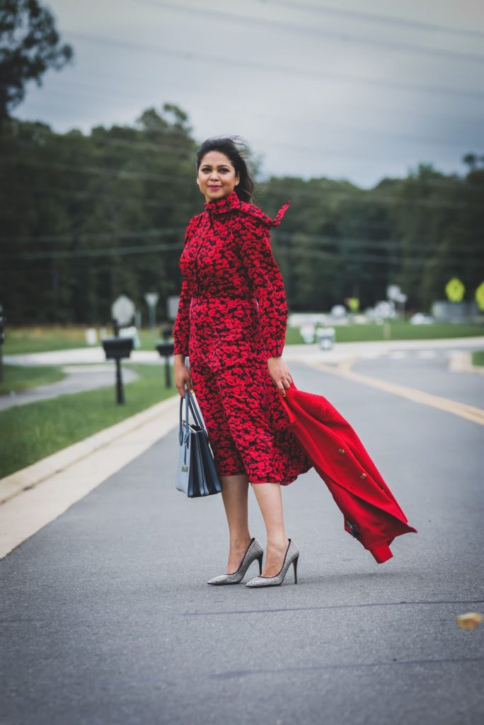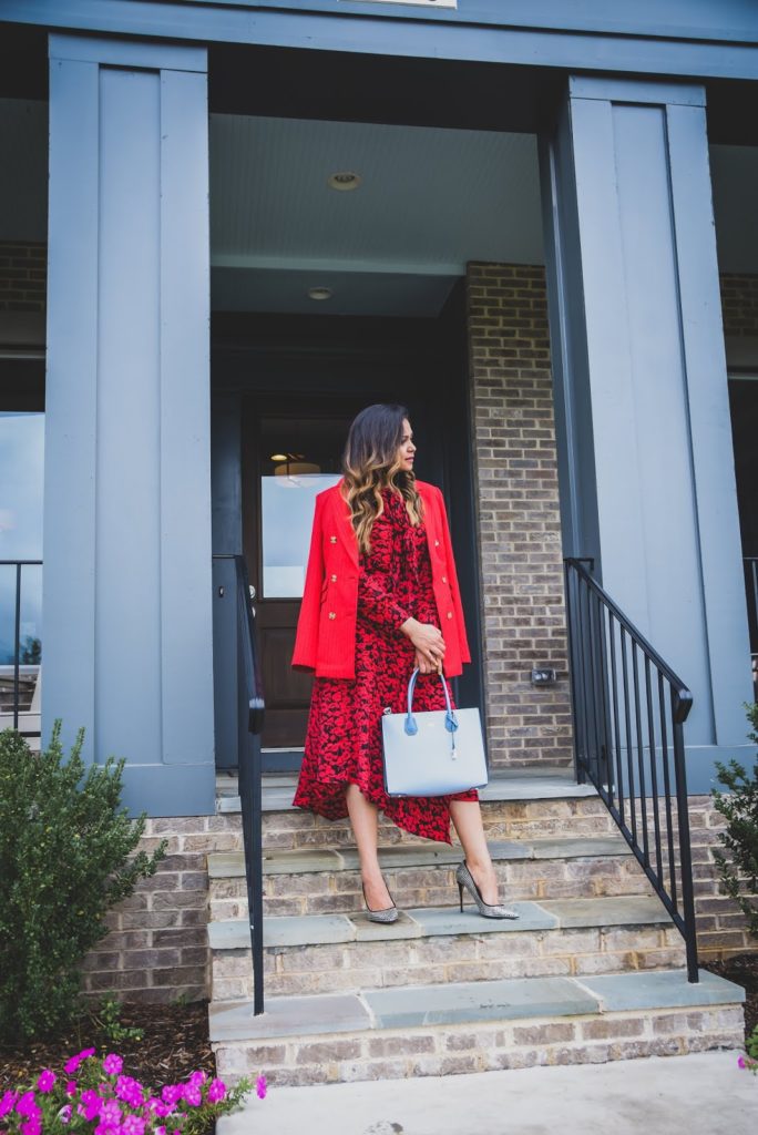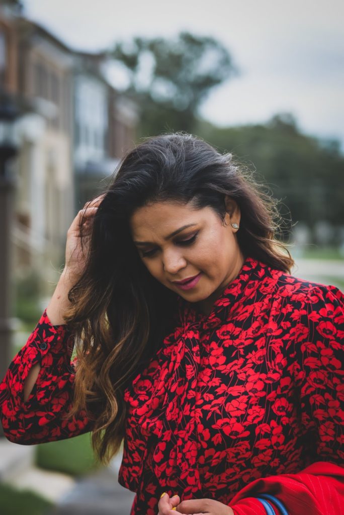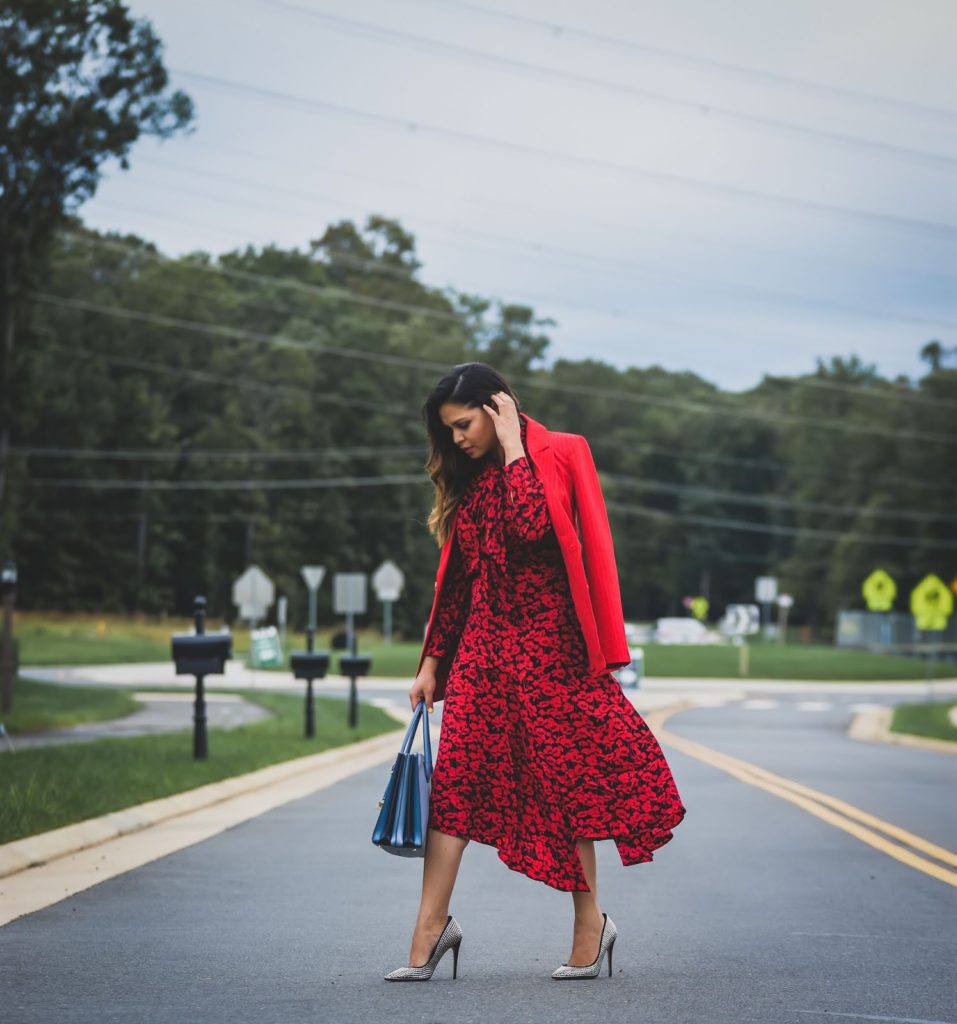 1) COLORS – colors are a great way to add pizzazz to any look. When I say pizzazz in no way do I mean obnoxiously over the top neons. I mean softer but brighter colors like red, blue, pinks and purples. If wearing a bright top and a bright bottom makes you a bit uncomfortable, how about going monochromatic, as in my case. The coordinating separates look cohesive without looking over the top. If that’s still too bright for you, how about adding a pop of color by pairing your basic neutral bottom with a brighter blouse or blazer!