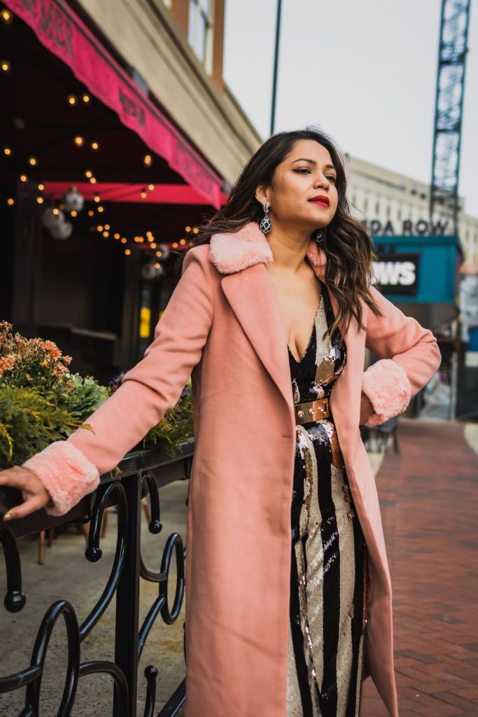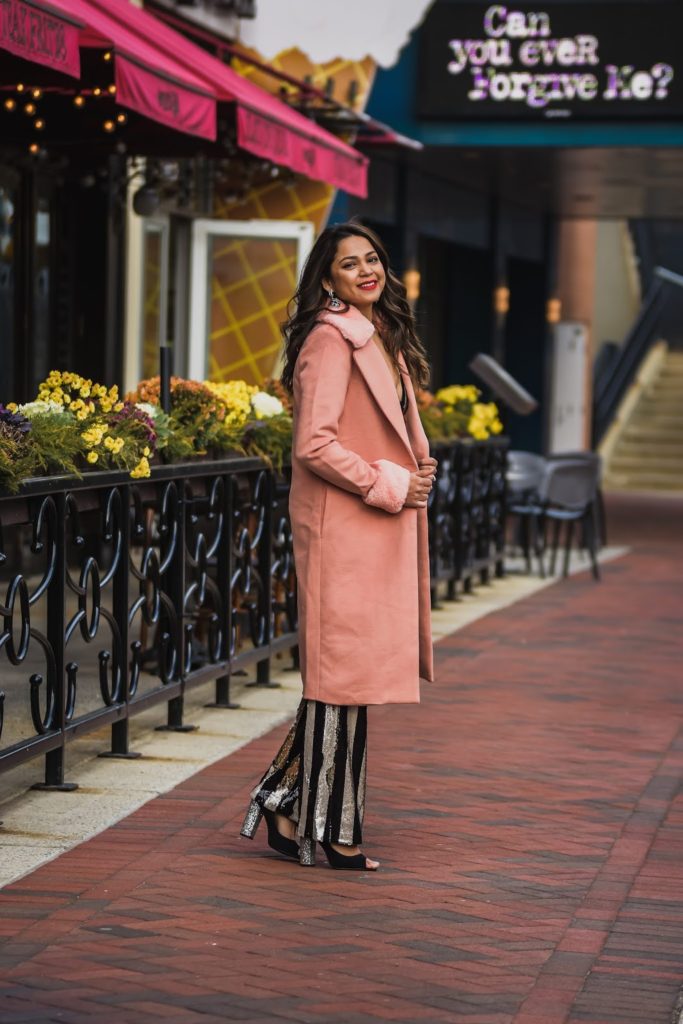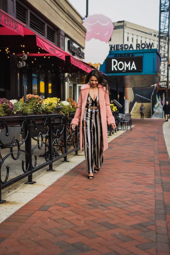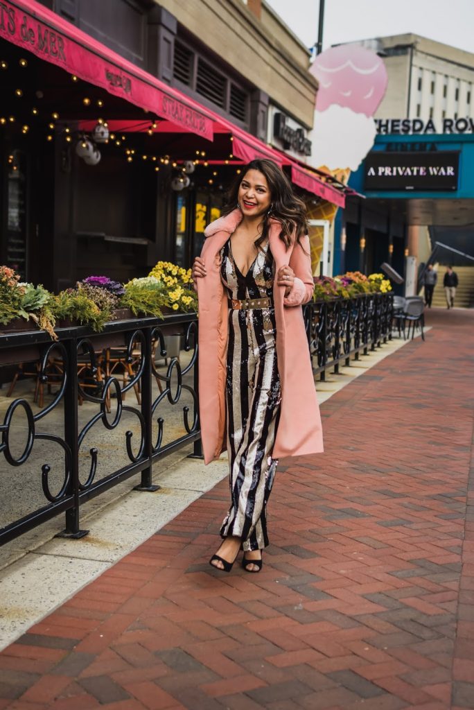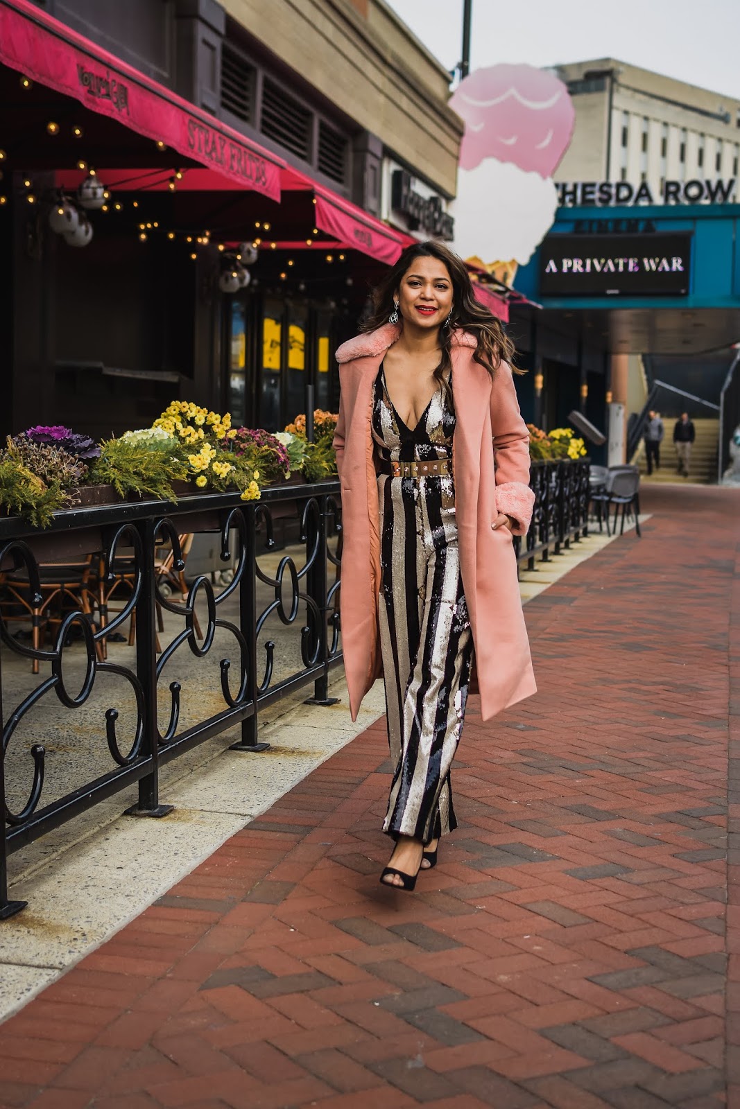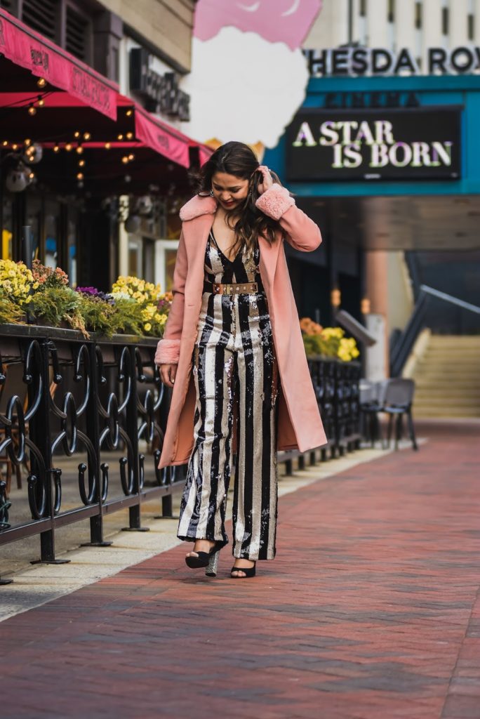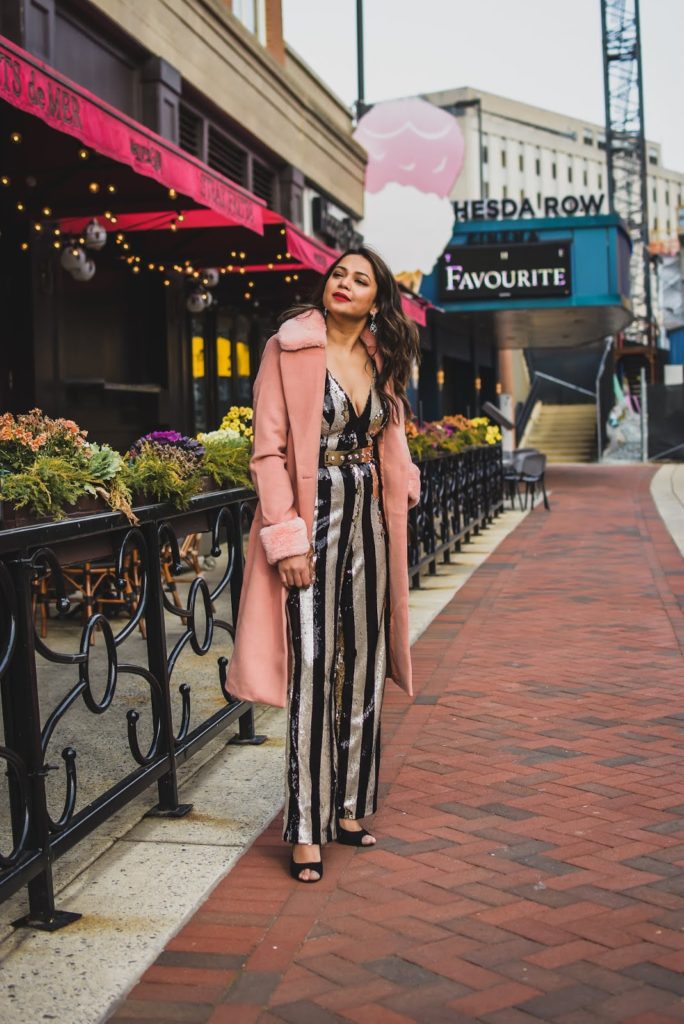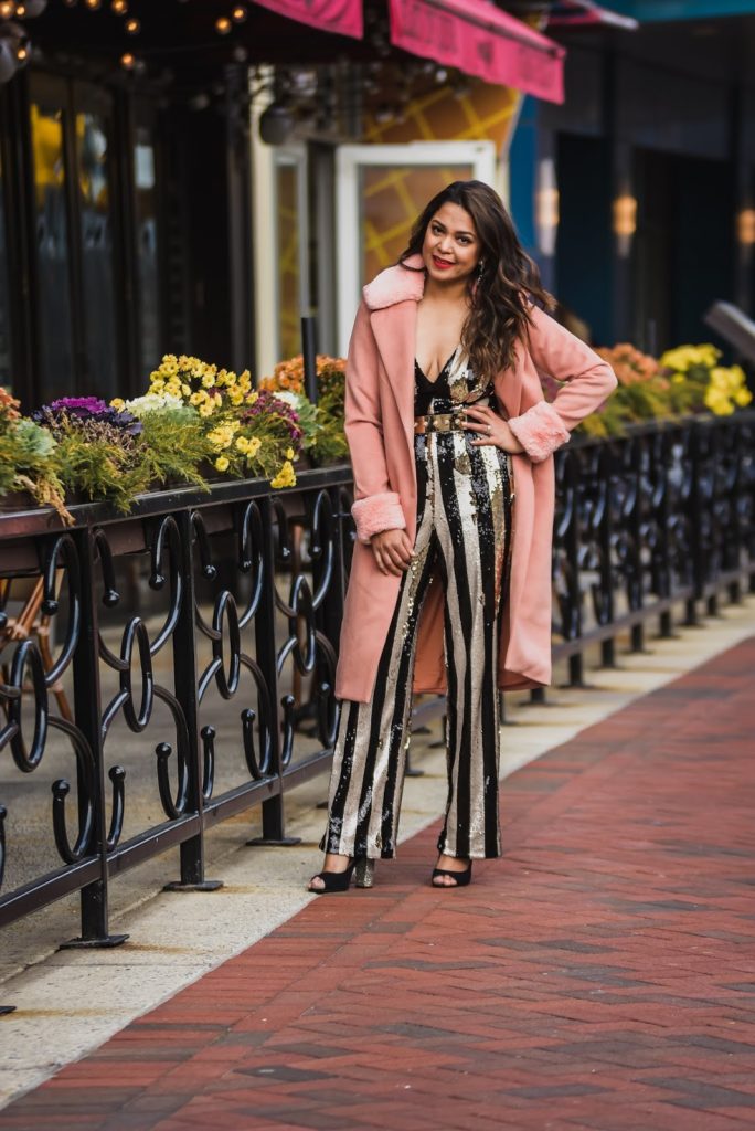 I had always wanted to wear a sequin jumpsuit and when I spotted this online, my heart skipped a beat. It is a tad bit low cut in the front, but you could get away without it looking trashy. The jumpsuit fits TTS, and I am wearing a size ‘S‘. Since it is an almost neutral in black and white outfit, I had to add some color, hence the fur collar jacket. I could have skipped the belt, but I wanted to create a more slimming and flattering silhouette, hence the belt.