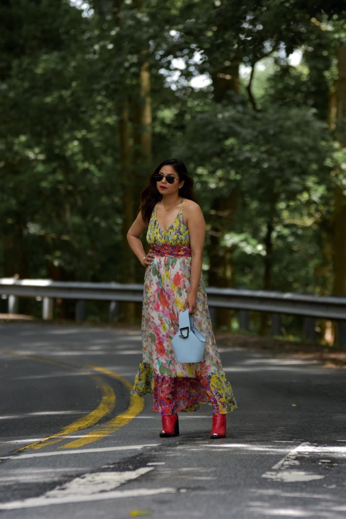 This floral maxi dress looks gorgeous on you. I love how you paired it with red boots.